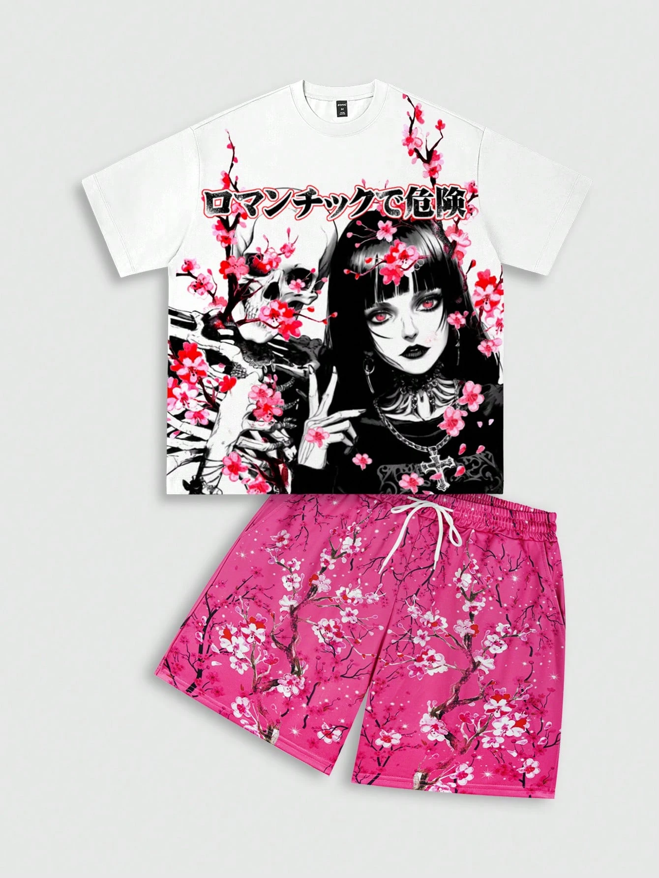 Anime Ensemble t-shirt court imprimé et short oversize, style punk décontracté, style de rue vintage pour hommes