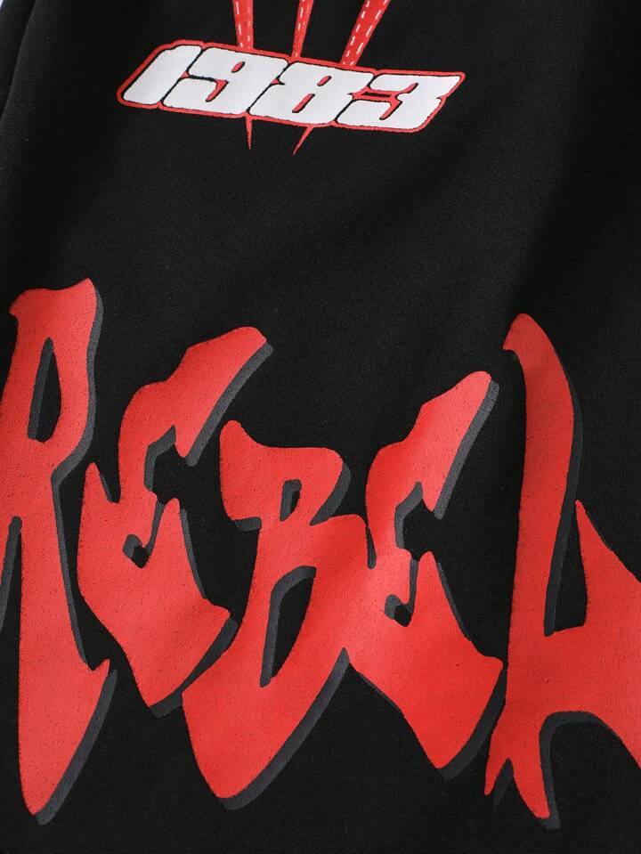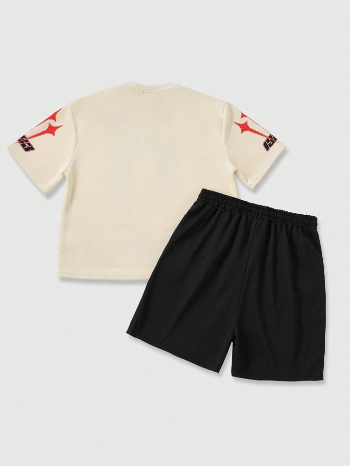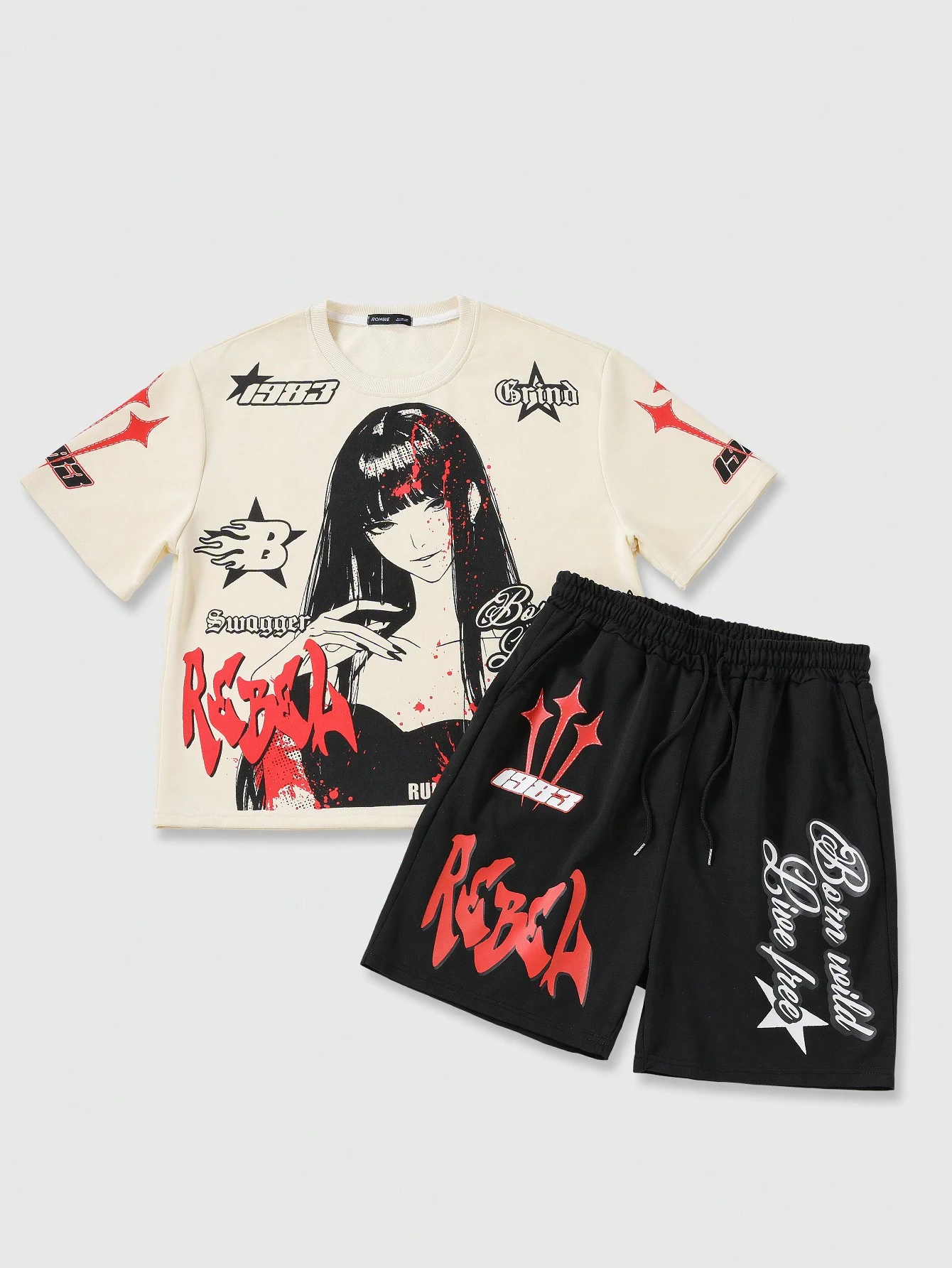 Anime Ensemble t-shirt à col rond et short à cordon de serrage imprimé avec lettres et personnages de dessins animés, décontracté, pour hommes