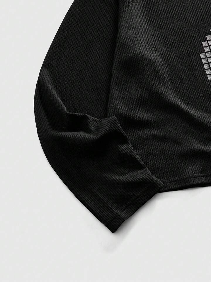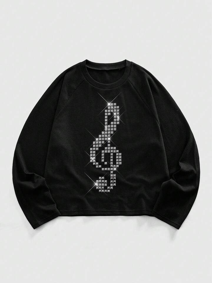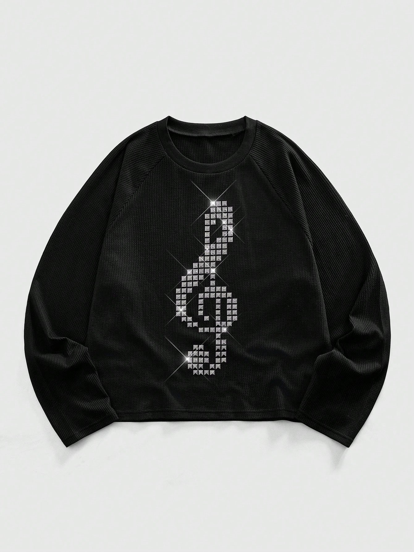 T-shirt en tissu gaufré à manches raglan avec motif de rivets et de notes, style mode décontracté pour festival de musique pour hommes, printemps/automne