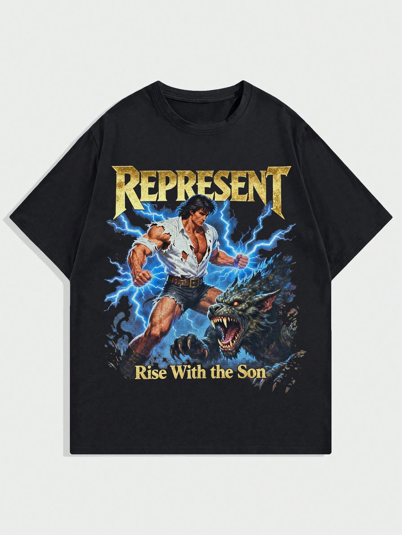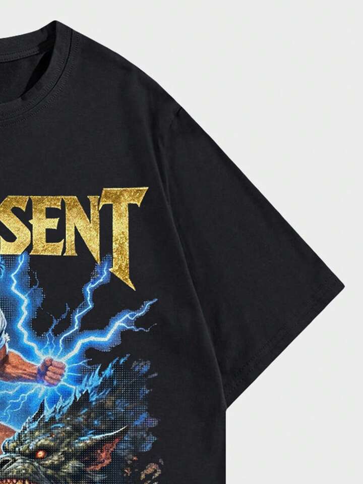T-shirt noir à manches courtes pour hommes, style décontracté pour le port quotidien et les déplacements. Imprimé avec un slogan et un personnage d'anime monstre. Idéal pour l'été.