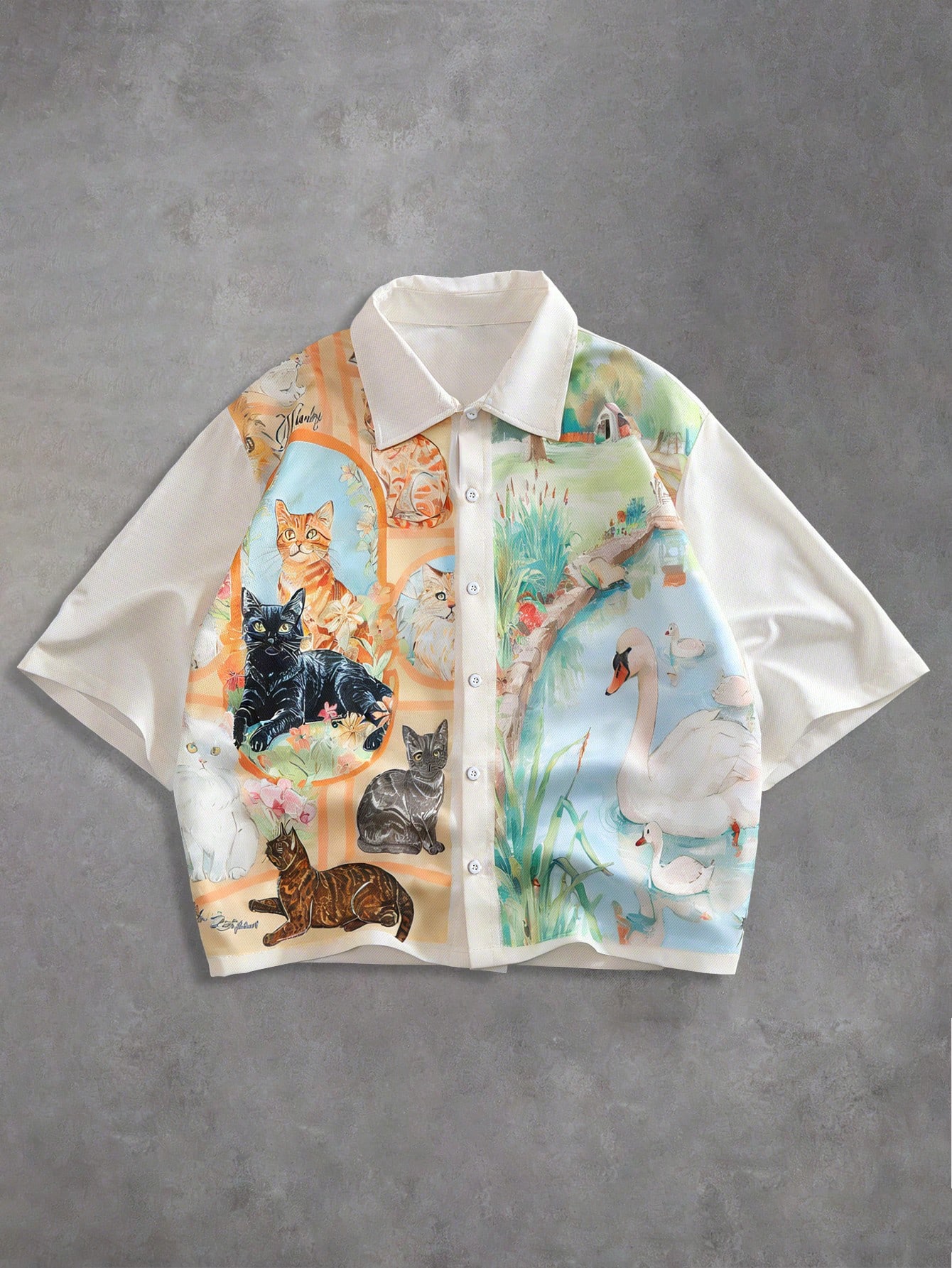 Chemise décontractée à manches courtes avec boutons et imprimé chat, pour l'été