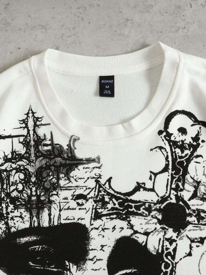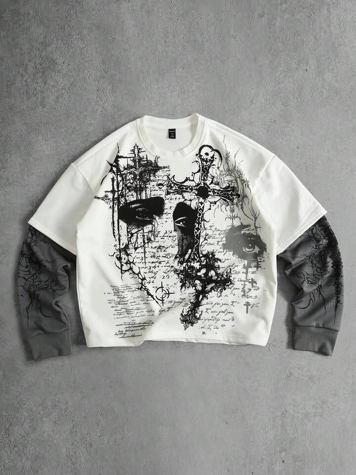 T-shirt casual à col ras-du-cou à manches longues avec imprimé croix, effet deux pièces pour hommes