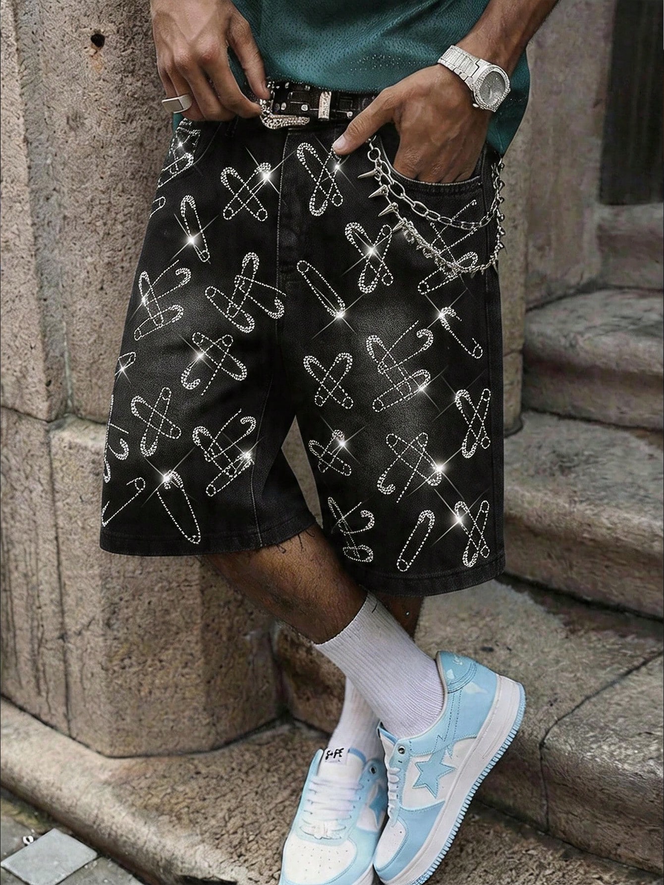 Short en jean décontracté pour hommes avec poche à fermeture éclair et ornements de strass