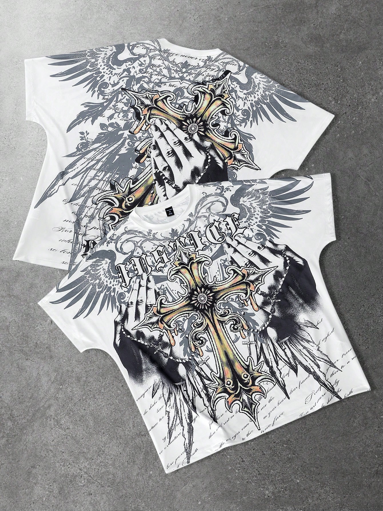 T-shirt décontracté à col rond à manches courtes avec imprimé lettres et croix pour hommes