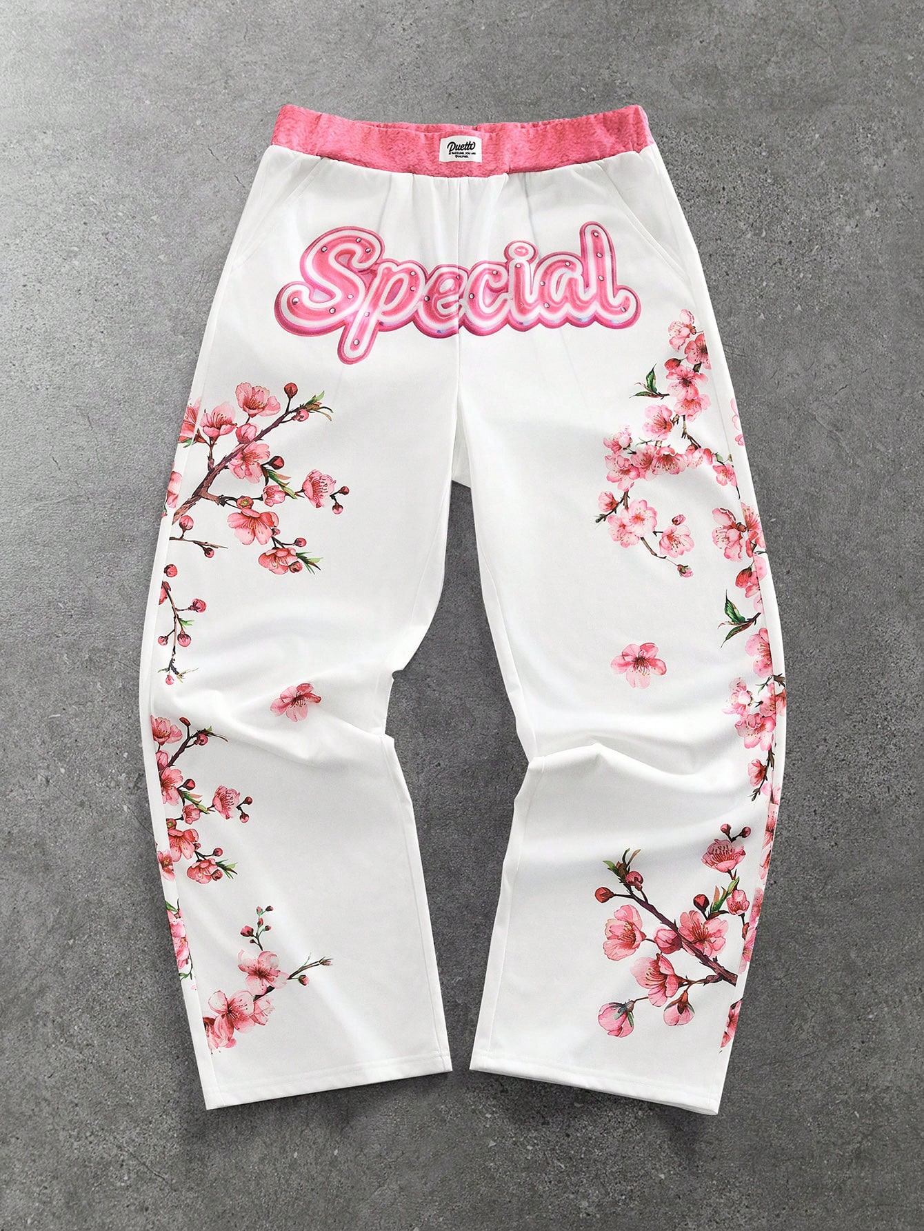 Pantalon de survêtement ample à jambes larges avec imprimé lettres et fleurs, style décontracté pour hommes