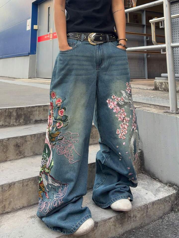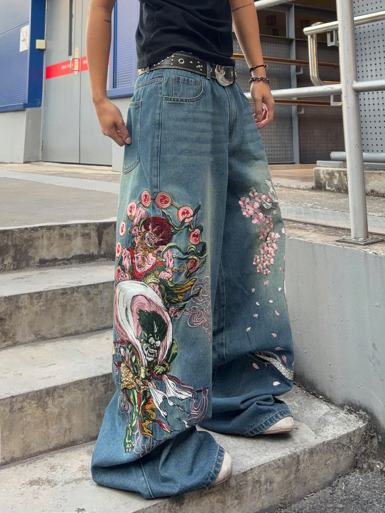 Jeans ample à jambe large avec poche brodée de monstre pour hommes