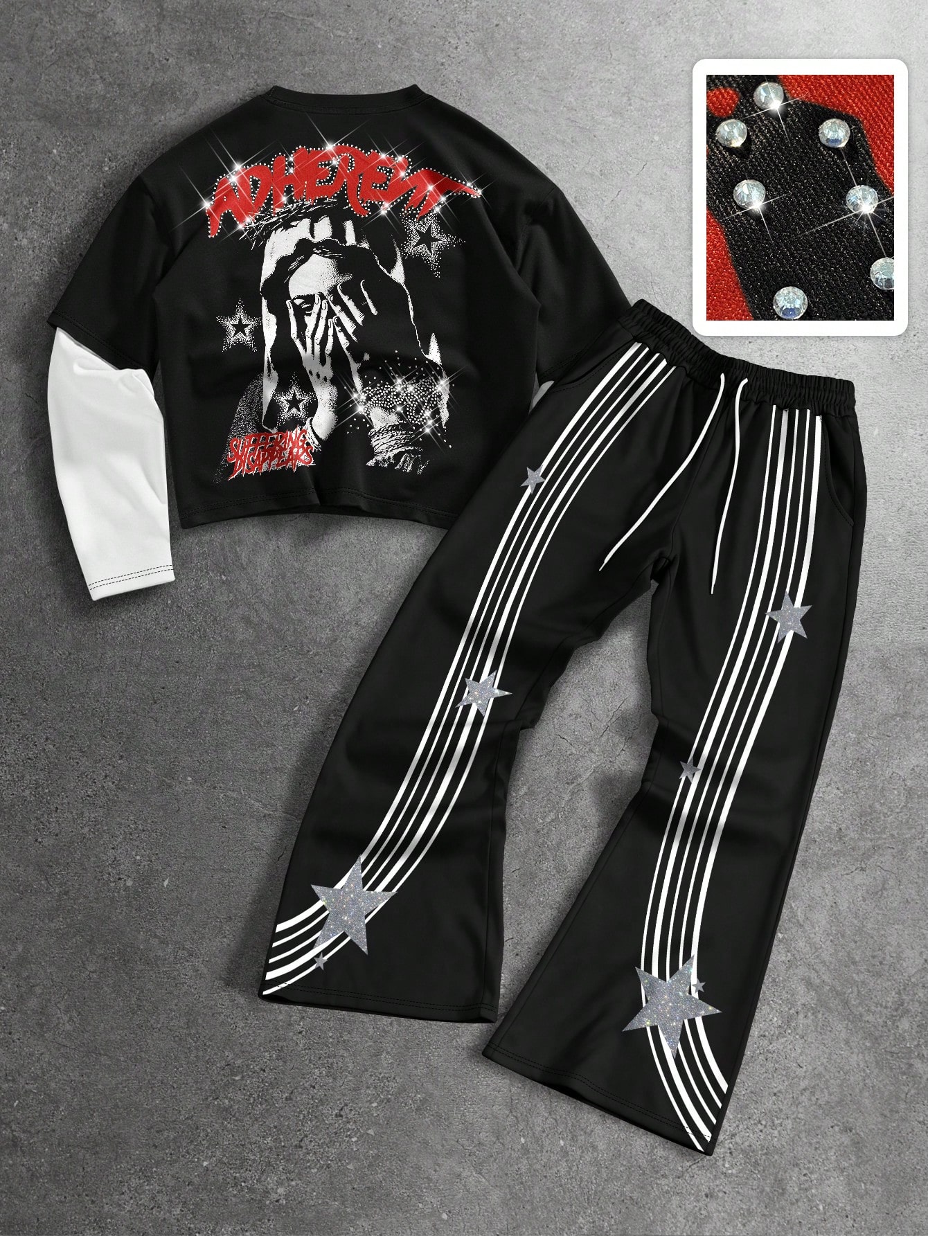 Ensemble de 2 t-shirts décontractés à manches longues et col rond avec imprimé motif créatif pour hommes