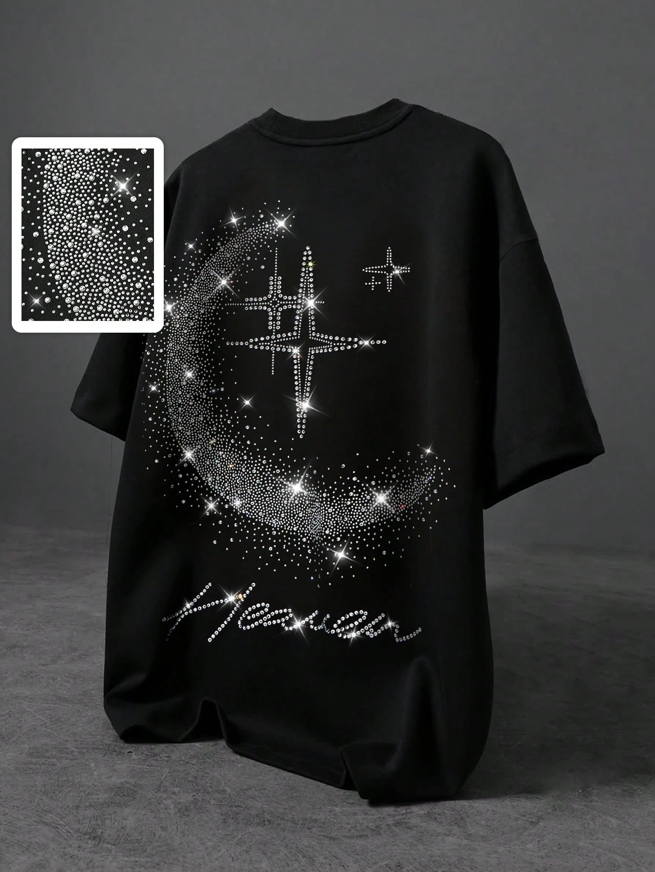T-shirt à col rond et manches courtes pour hommes avec ornements de strass en forme de lune et d'étoile