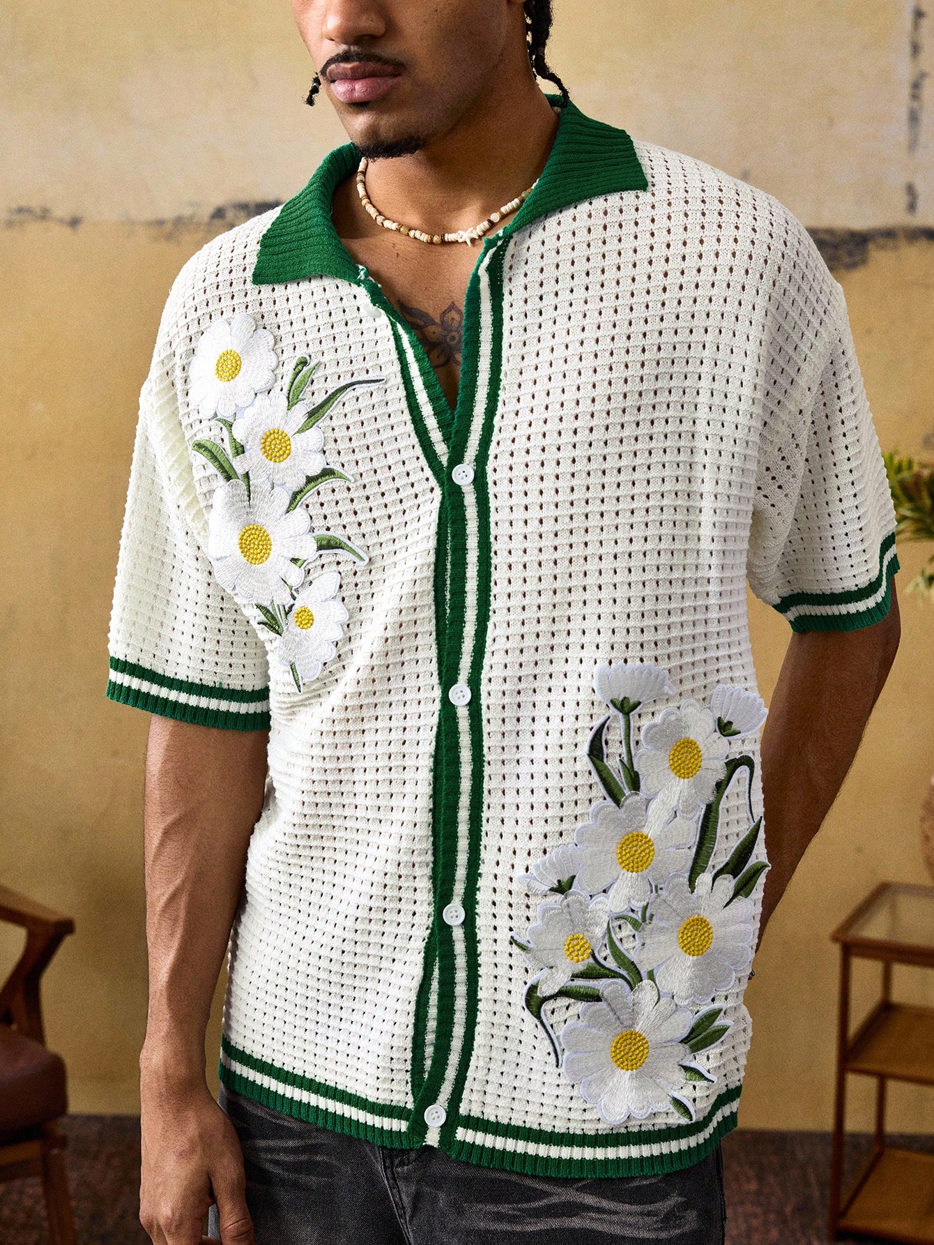 Top à manches courtes avec boutons et broderie, mode de rue pour hommes
