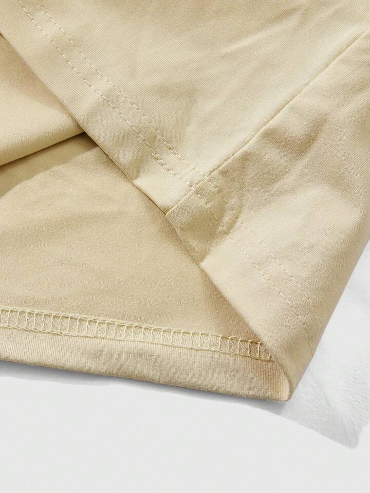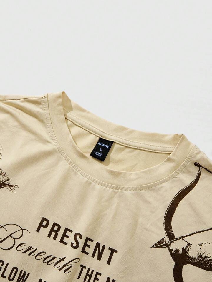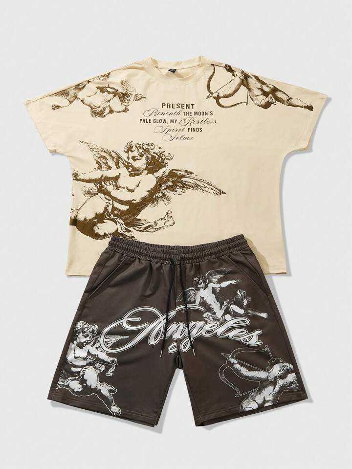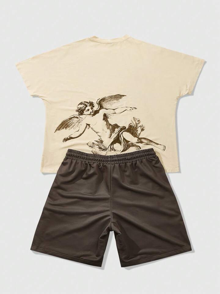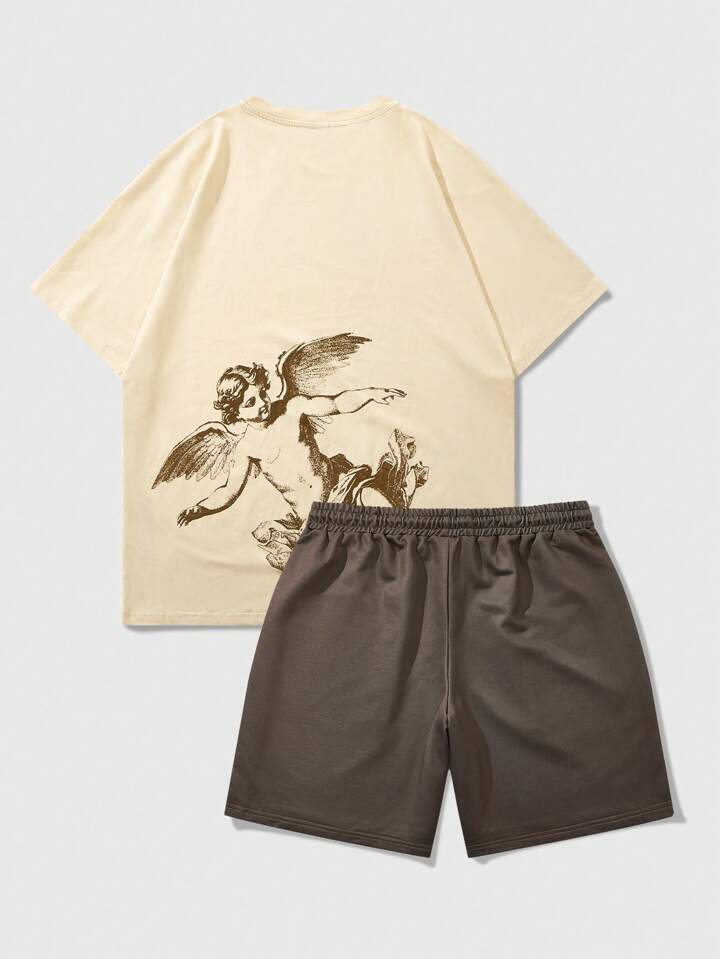 Street Life Ensemble court à manches pour hommes, Top à manches chauve-souris col rond avec short à cordon de serrage à la taille, Top kaki avec pantalon marron, t-shirt avec imprimé ange vintage, short marron avec imprimé ange vintage, style décontracté de rue jeune pour le quotidien, le trajet ou les vacances, un excellent choix de cadeau pour le mari ou le petit ami