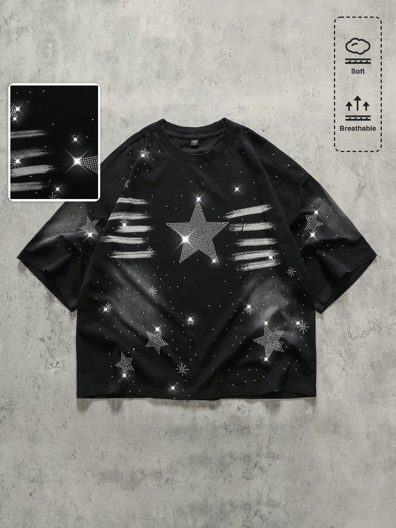 T-shirt à manches courtes pour hommes avec strass et motif étoile, style streetwear