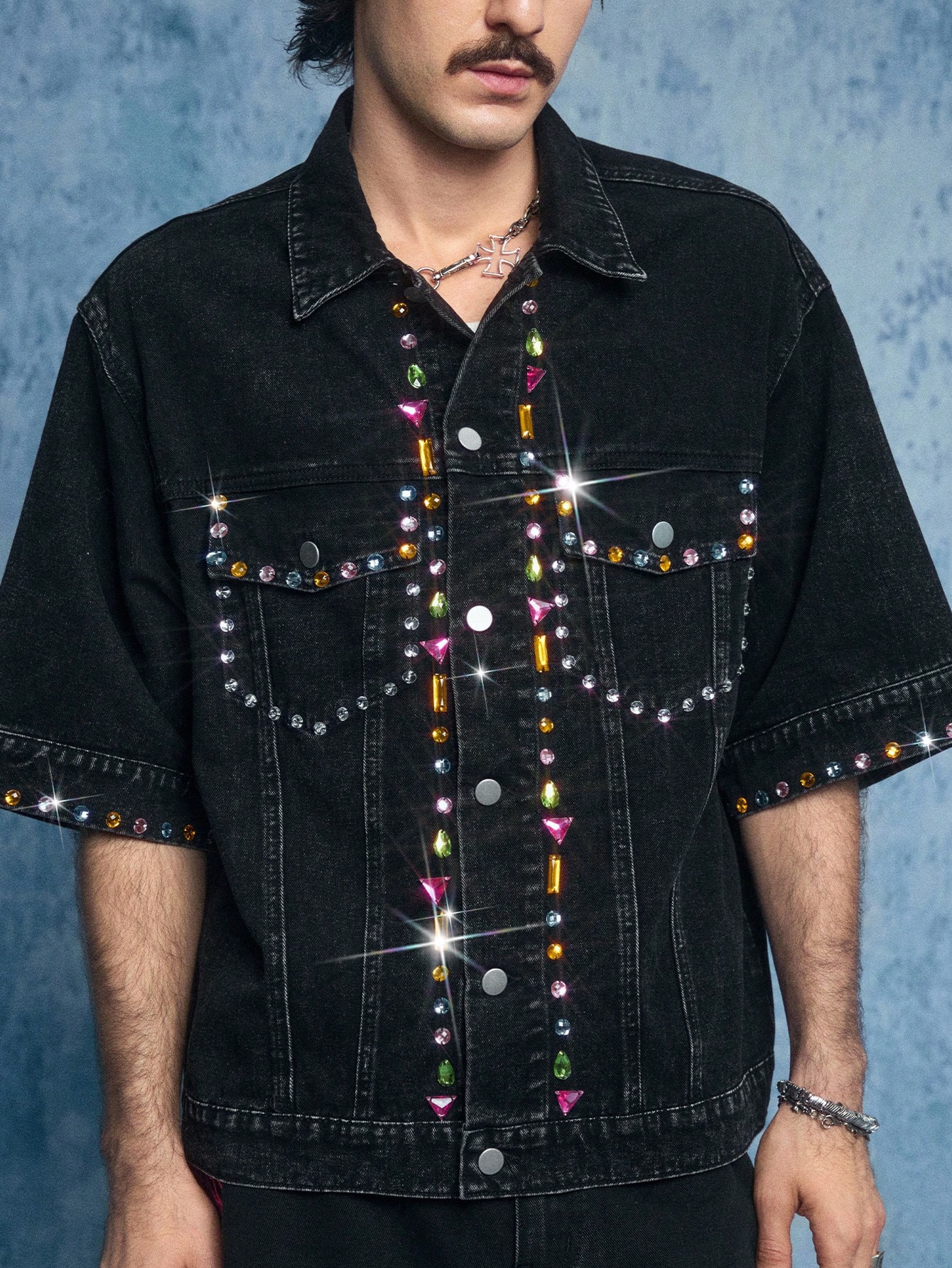 Street Life Top en denim à manches courtes pour homme, col à revers, simple boutonnage, poche, décoration de strass, polyvalent et décontracté pour un usage quotidien