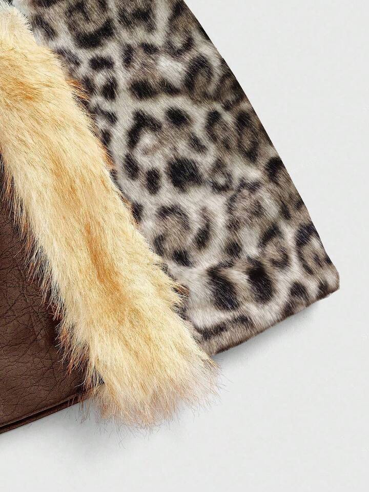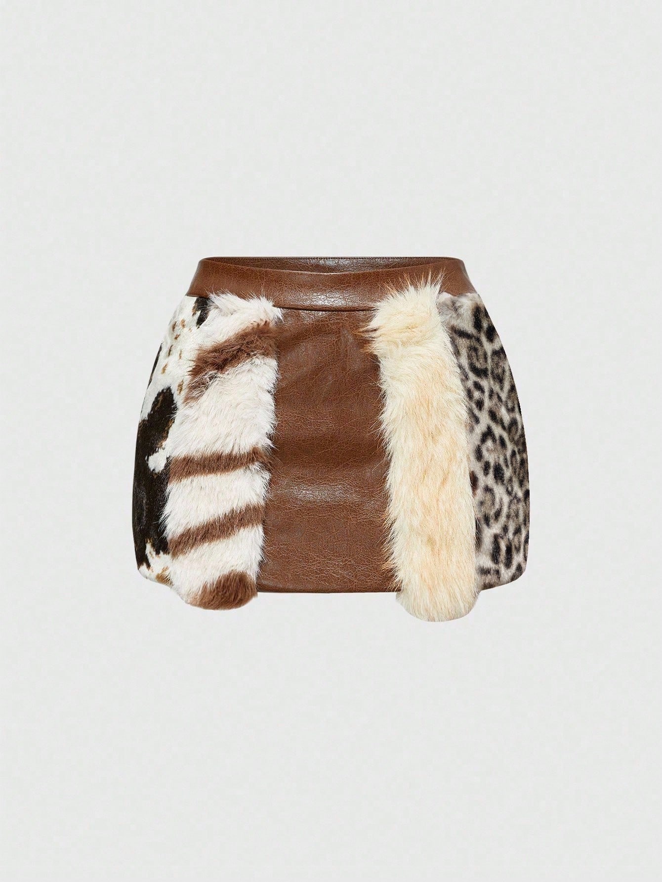 Jupe mini taille basse en PU avec patchwork de fausse fourrure et imprimé animal, style hippie vintage "Millennium Babe" pour femmes