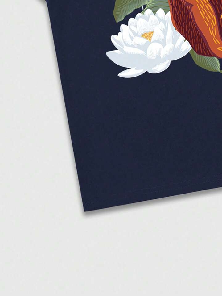 Casual T-shirt à manches courtes à l'imprimé fleur de lotus bleu marine et blanc, design minimaliste qui attire l'attention