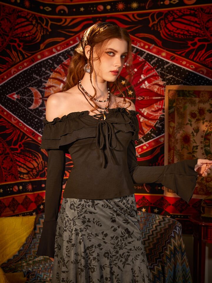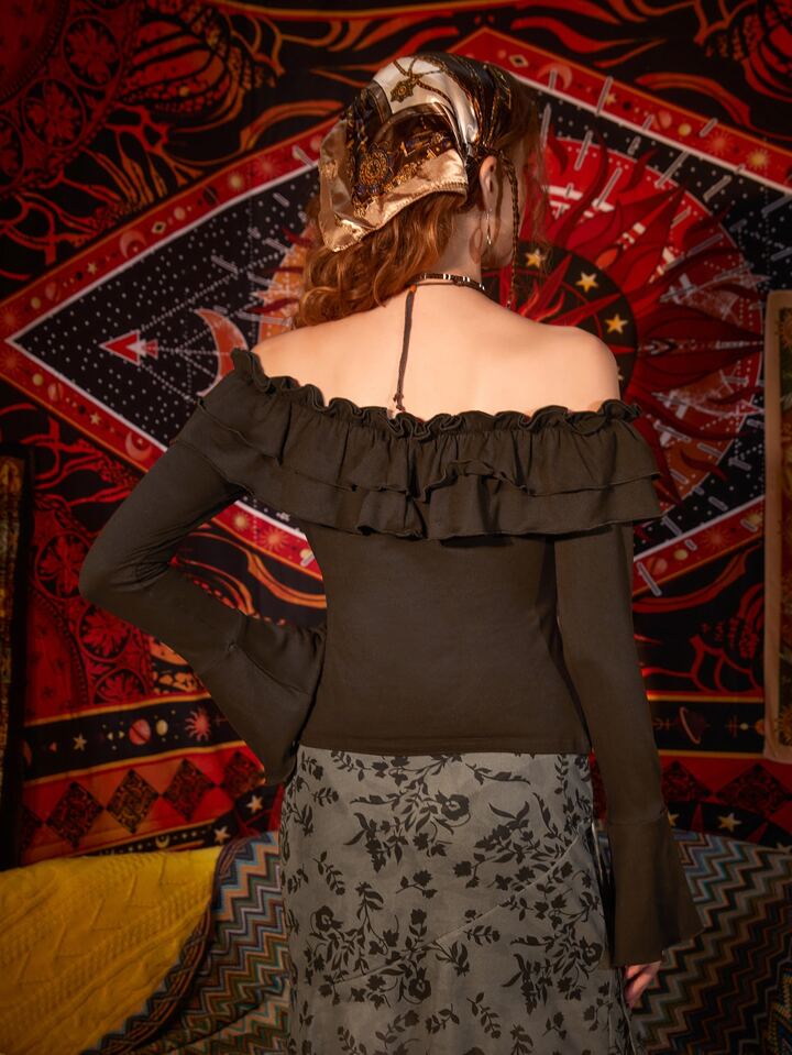 T-shirt col bardot à plis manches évasées