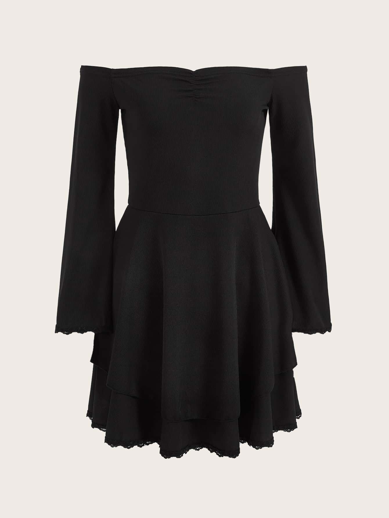 Robe col bardot à ruché ourlet en dentelle