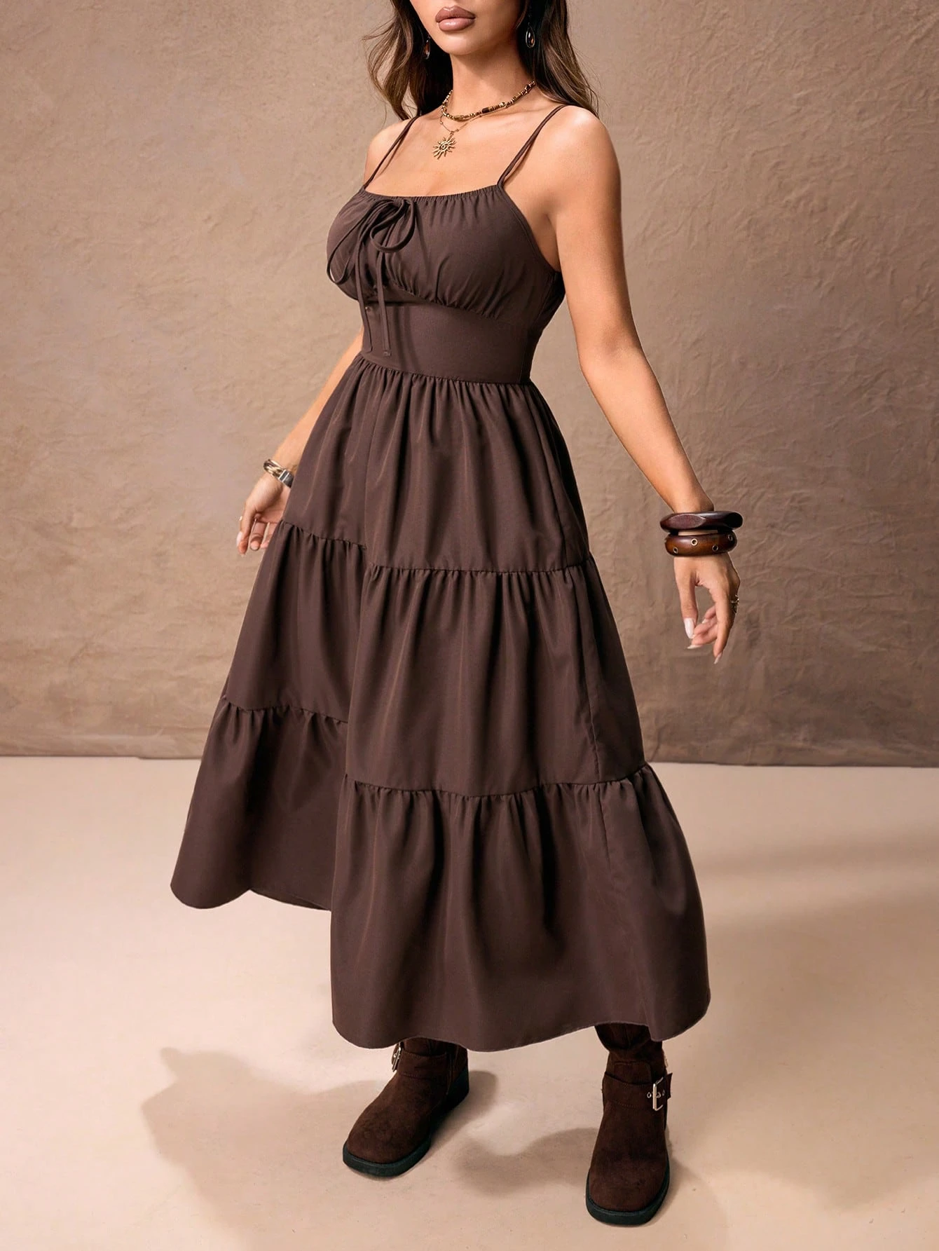 PETITE Robe femme à bretelles fines, coupe évasée avec volant à l'ourlet, couleur unie