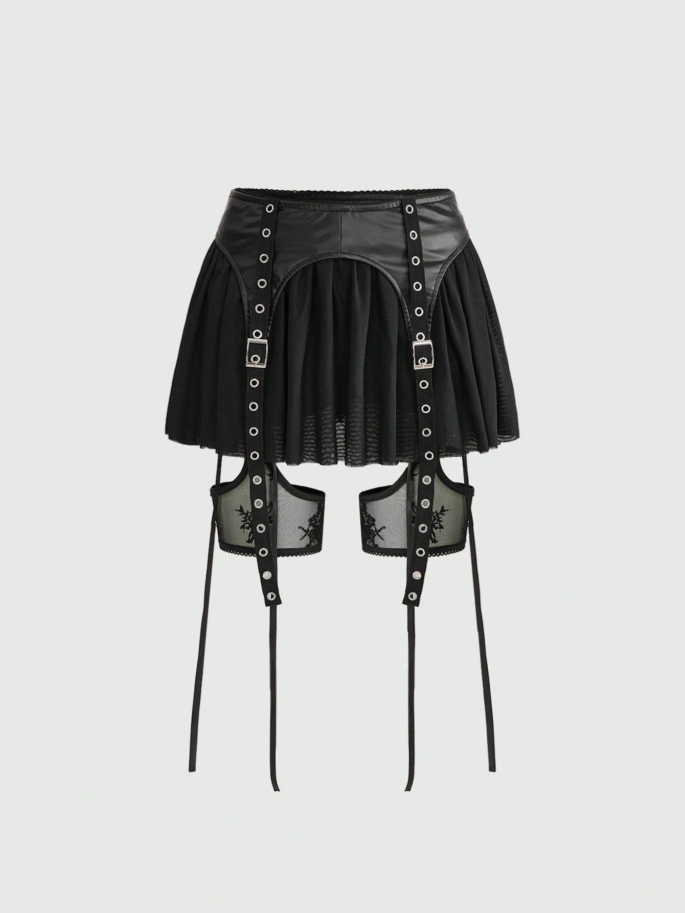 Jupe mini pour femmes en patchwork de PU et de maille avec rivets et lacets