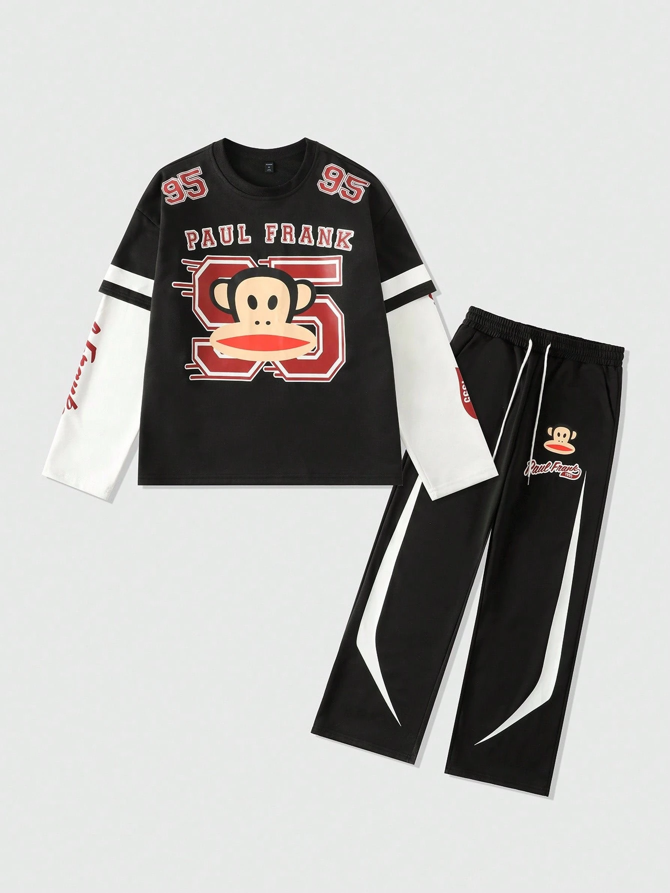 Paul Frank X ROMWE Ensemble Top et pantalon casual pour hommes avec imprimé blocs de couleurs, lettres et singe