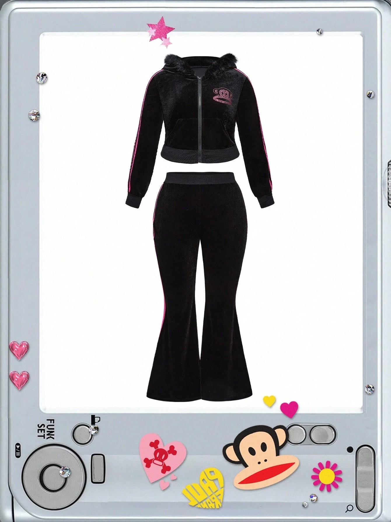 Paul Frank X ROMWE Ensemble 2 pièces grande taille, veste à capuche en velours vintage avec strass graphique et pantalon évasé, automne/hiver