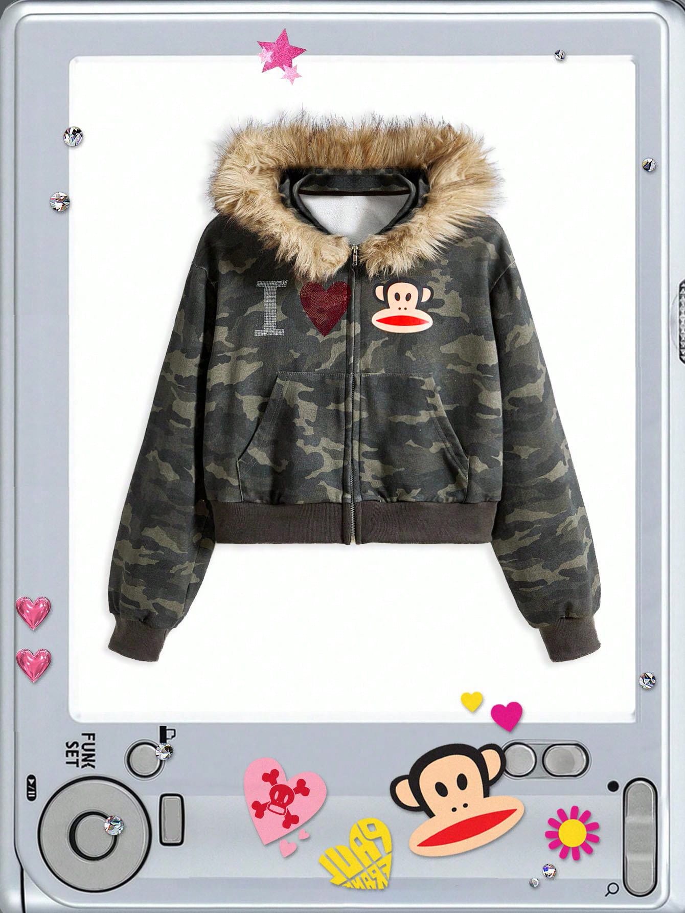 Paul Frank X ROMWE Sweat-shirt à capuche zippé, style mode de rue décontracté subculture Y2K pour femmes grandes tailles. Imprimé camouflage avec logo strass et ourlet effiloché.