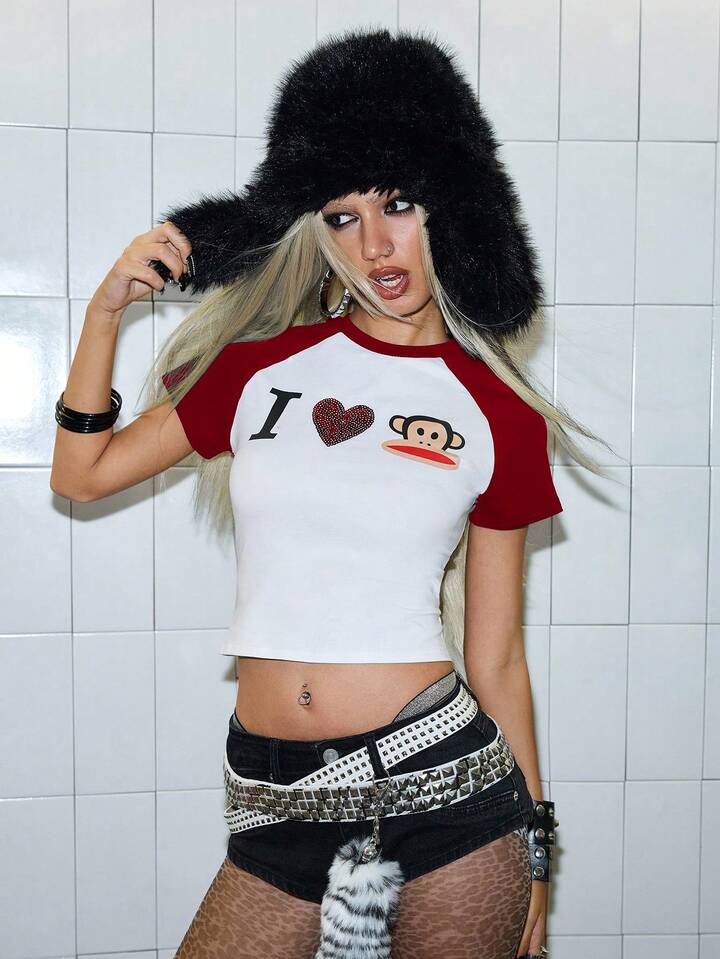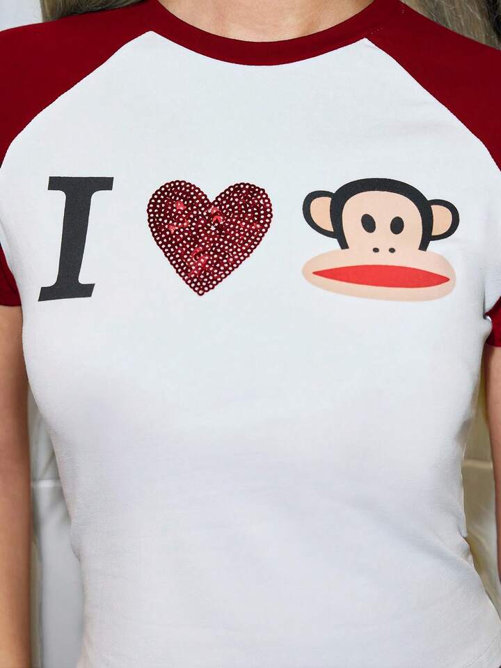 Paul Frank X ROMWE T-shirt ajusté à manches raglan avec imprimé singe, style décontracté pour femmes