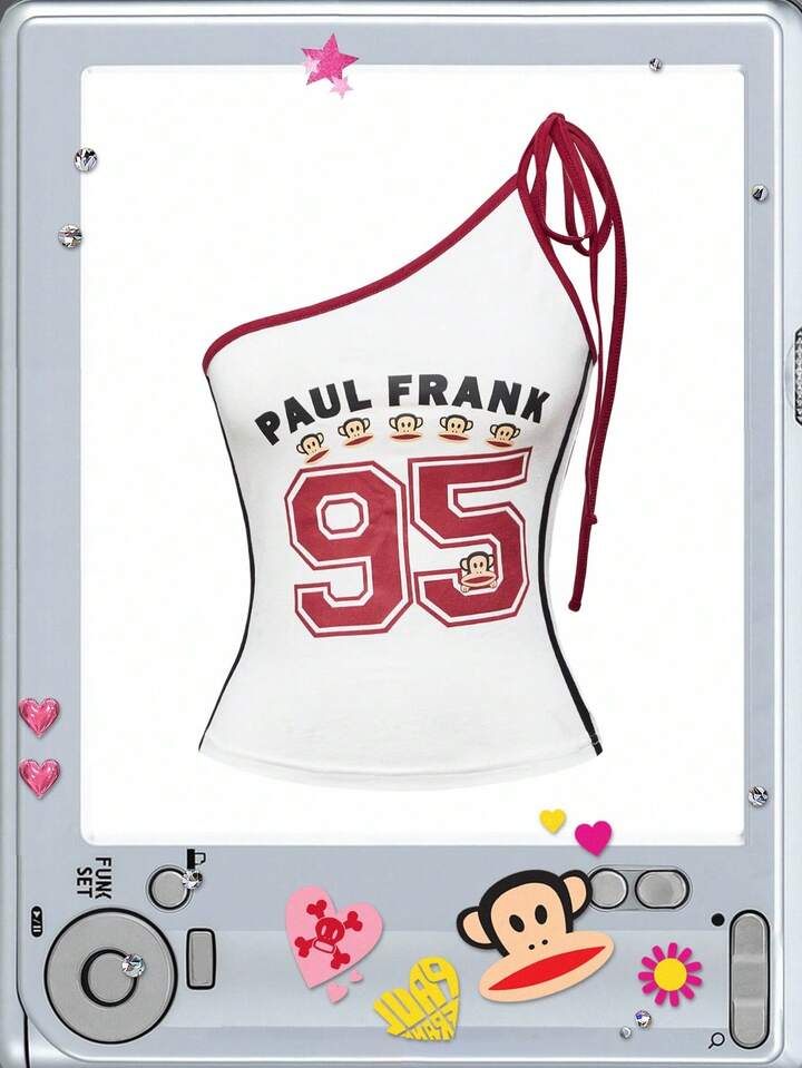 Paul Frank X ROMWE Top asymétrique à imprimé chiffres et bordure contrastée pour femme, style urbain