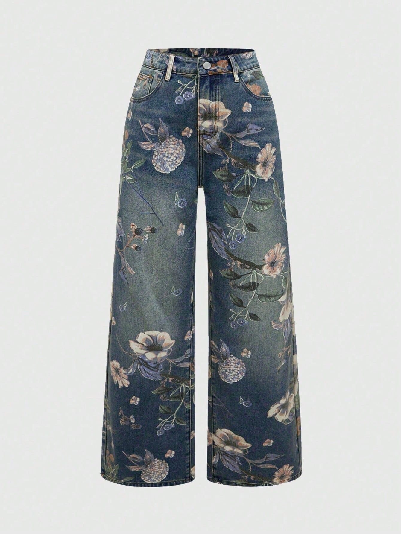 PETITE Jeans ample à jambe large, imprimé floral vintage lavé pour femmes