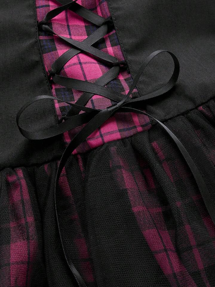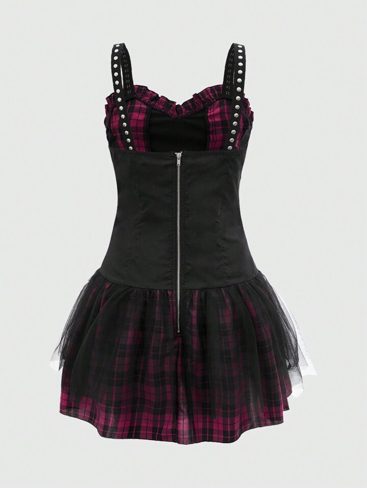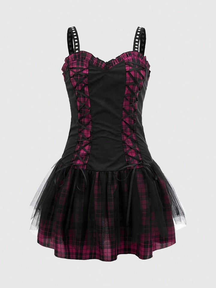 Robe à fines brides à carreaux avec tulle à lacets clouté