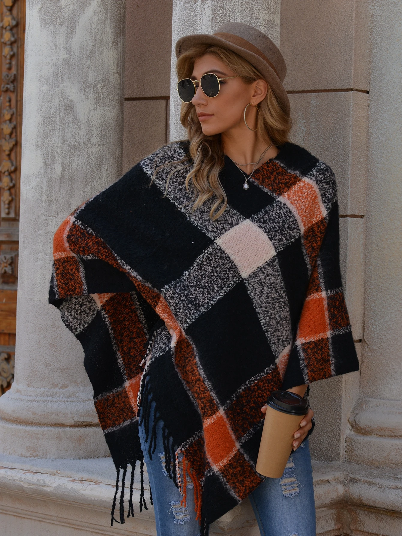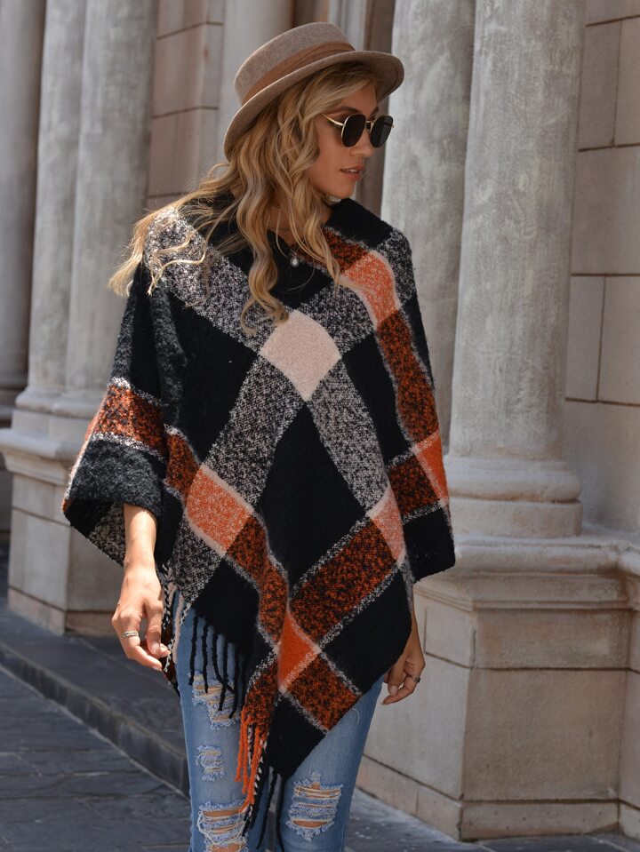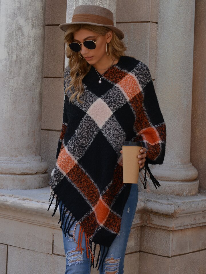 Poncho à carreaux avec franges