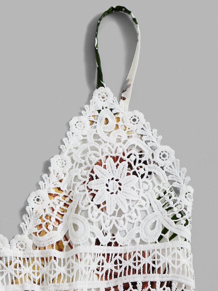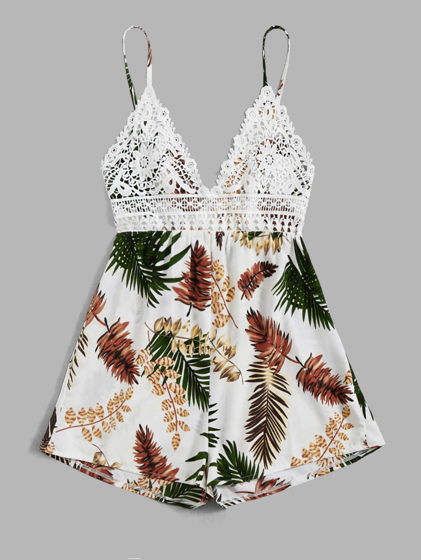 Combishort à fines brides à imprimé plante en dentelle