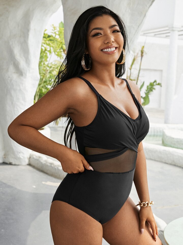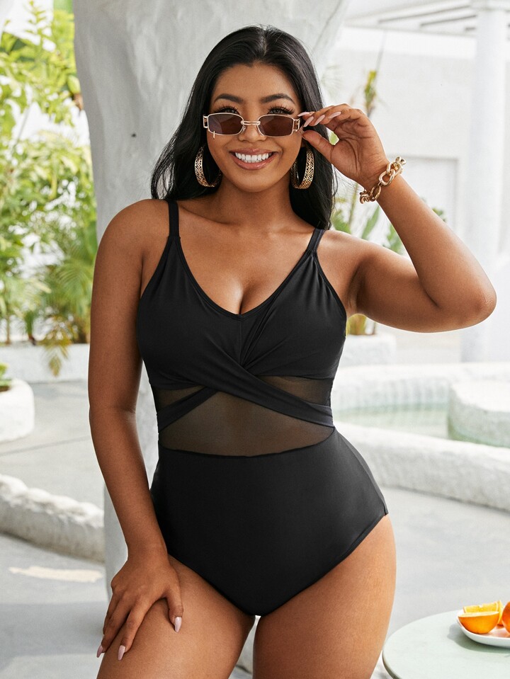 Maillot de bain une pièce avec empiècements de filet contrastés, parfait pour les vacances à la plage en été