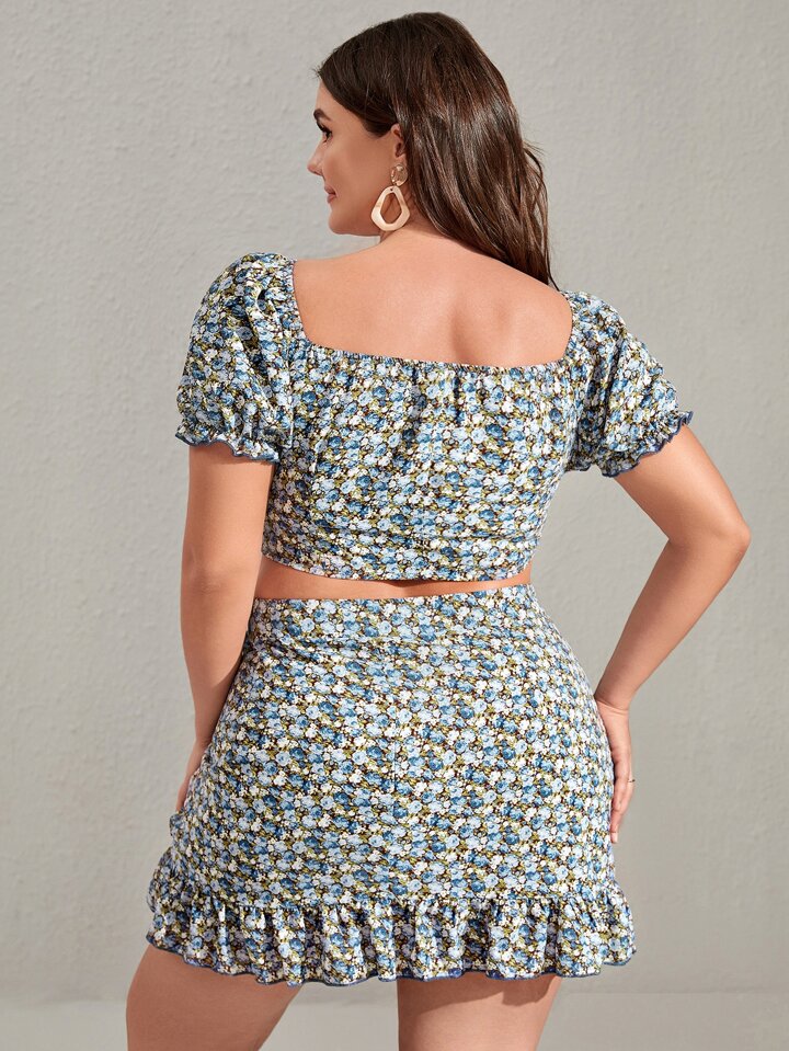Top court fleuri à nœud avec jupe