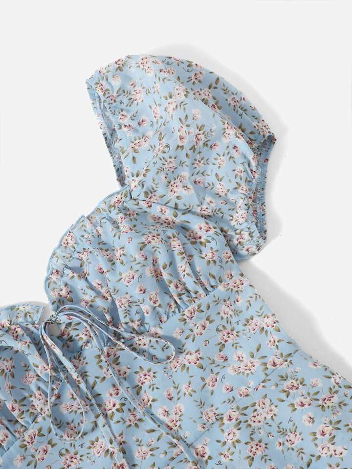 Robe fleuri à encolure de cœur manches bouffantes à nœud