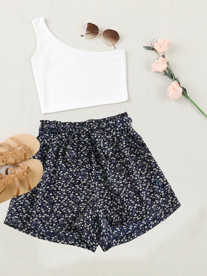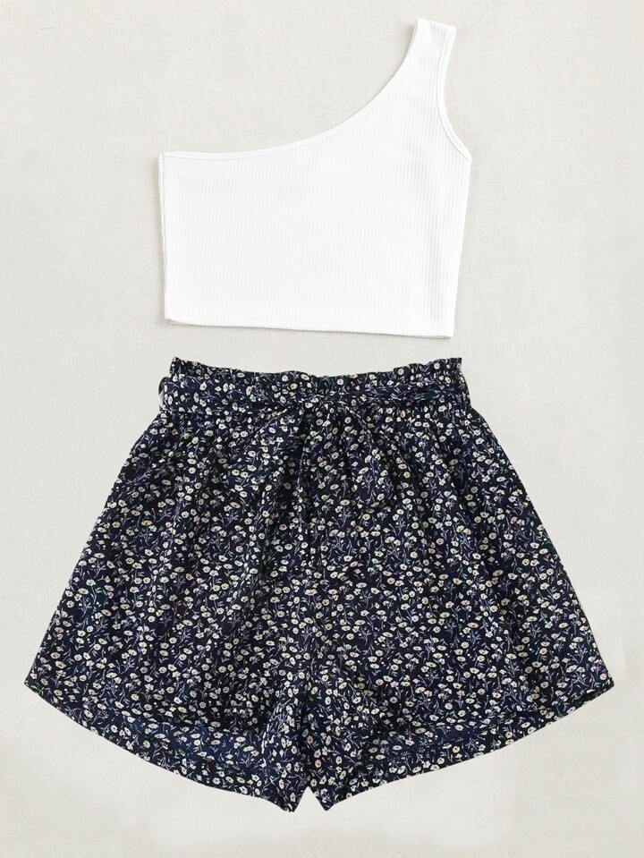 Ensemble short fleuri ceinturé et top à épaule dénudée