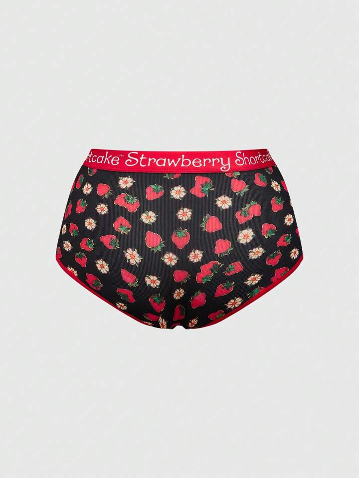 Ensemble lingerie comprenant un soutien-gorge sans armatures et un shorty en dentelle contrastée avec imprimé fraise, kawaii, grande taille