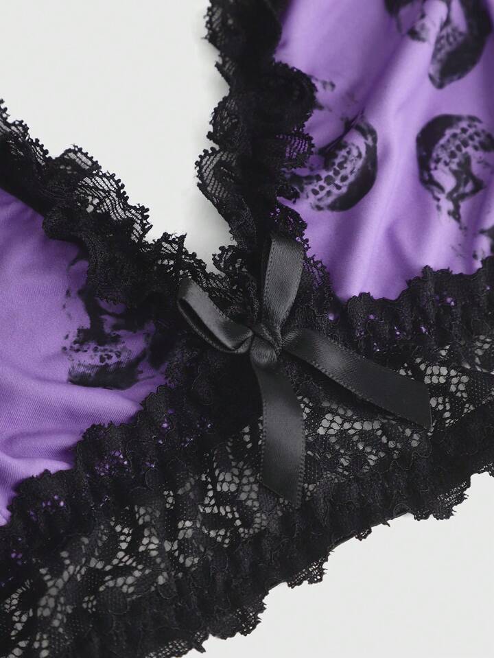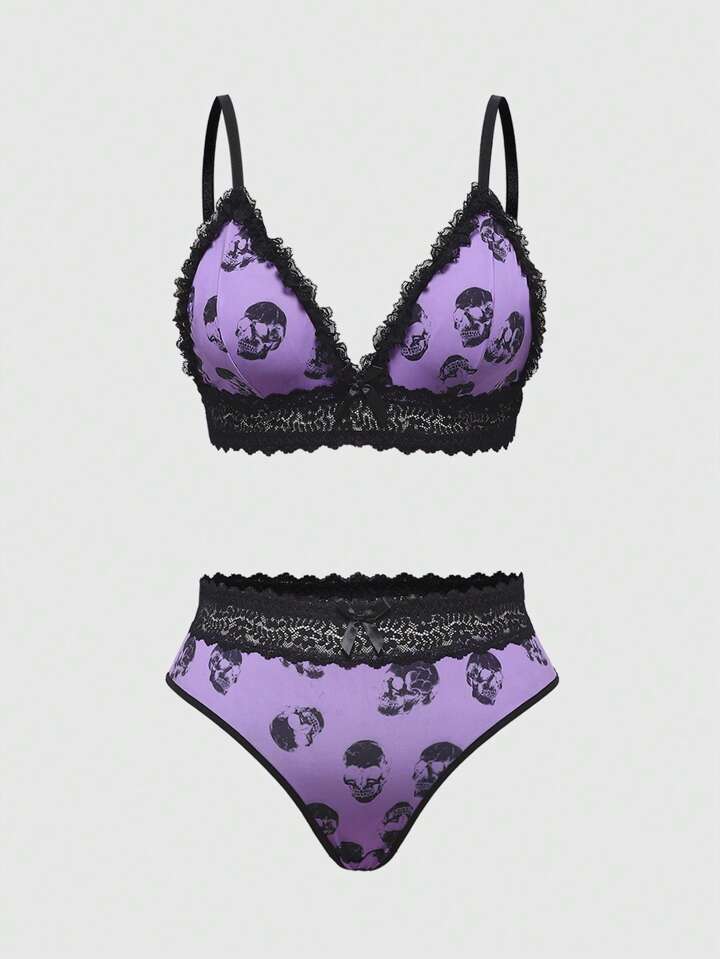 Ensemble de soutien-gorge brassière et culotte en dentelle à imprimé tête de mort gothique foncé grande taille