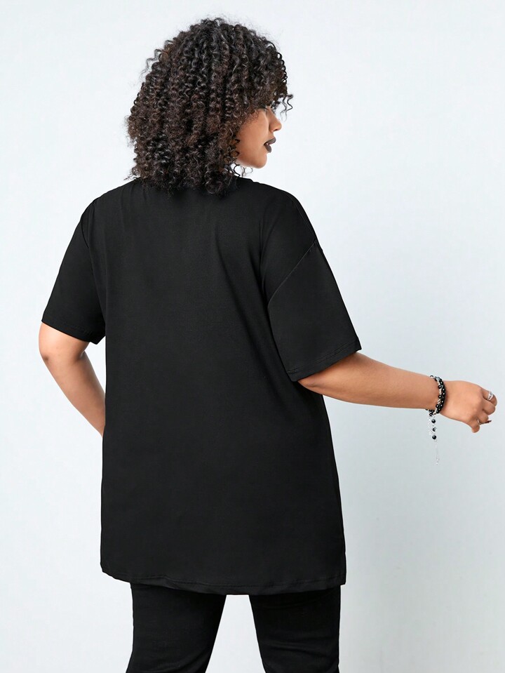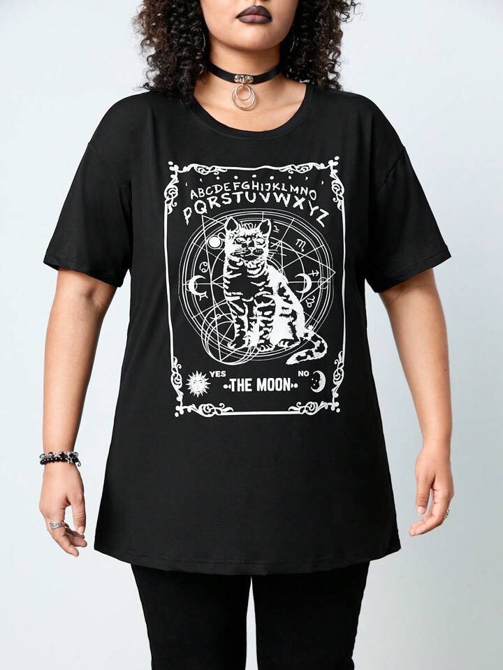 Hauts gothique sombre grande taille, t-shirt ample d'été avec impression chat noir mystérieux et carte, école