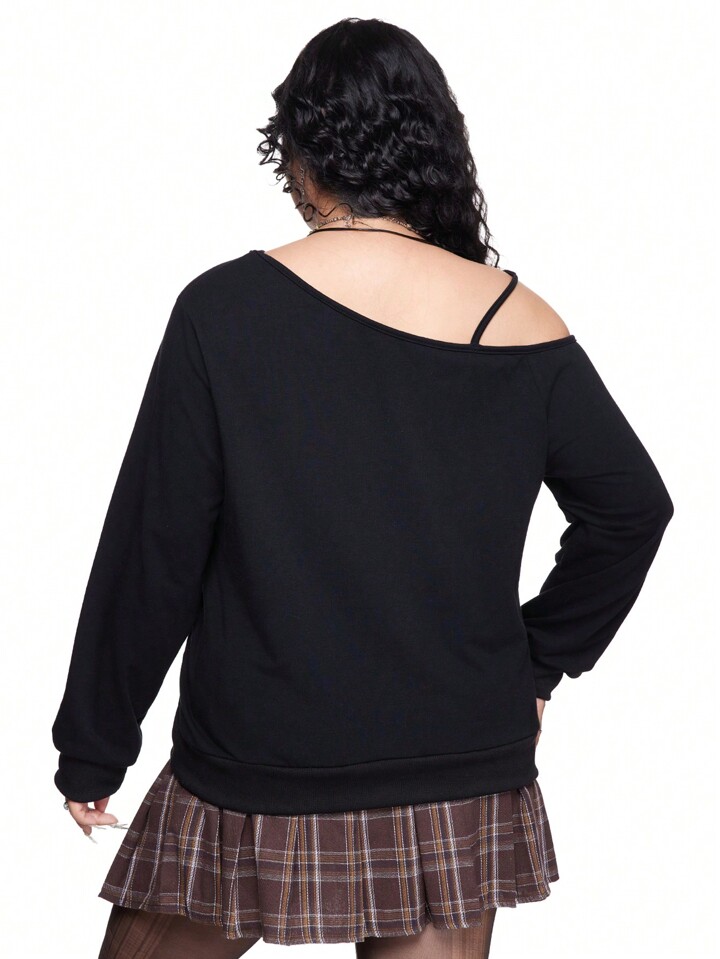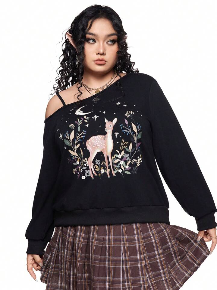 Fairycore Sweat-shirt vintage à l'épaule asymétrique avec imprimé de cerf, tailles grandes