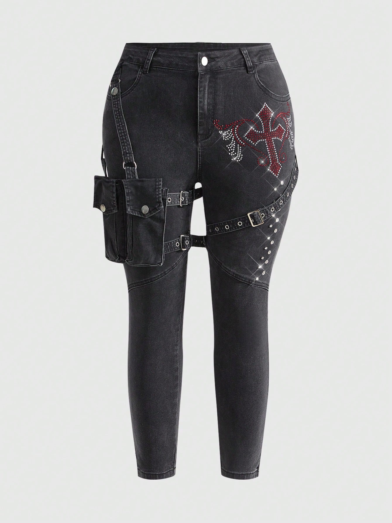 Jeans en denim vintage délavé avec poches cargo asymétriques, sangles croisées, ailes d'ange ornées de strass, style gothique grande taille. Pantalon long décontracté de rue grande taille pour l'automne/hiver