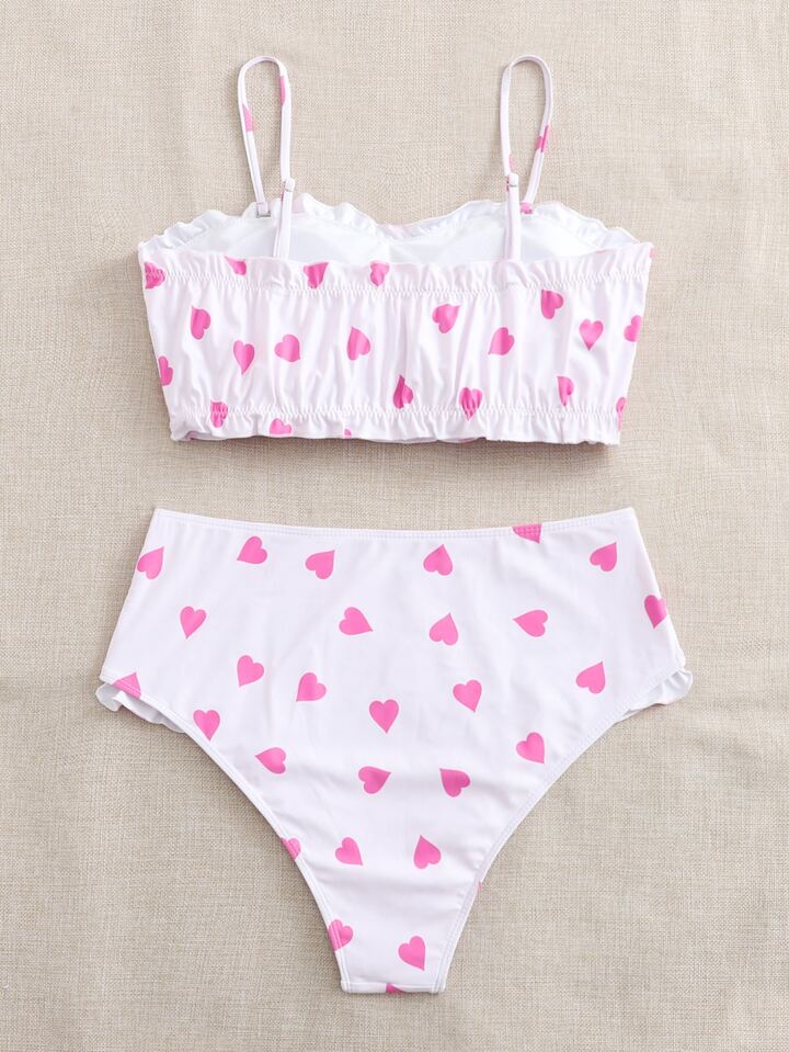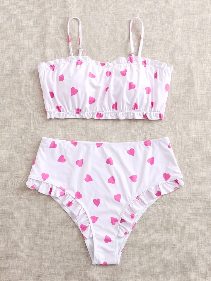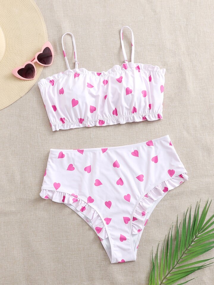 Maillot de bain bikini taille haute avec cœurs imprimés et garniture à volants pour femmes en grandes tailles, parfait pour l'été à la plage