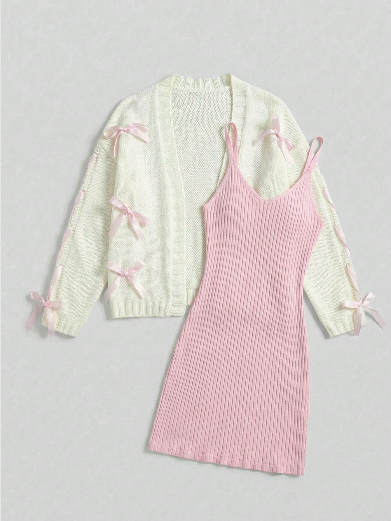 Kawaii Ensemble pull tricoté avec nœud élégant pour femmes grandes tailles, robe pull et cardigan grande taille pour femmes en automne/hiver