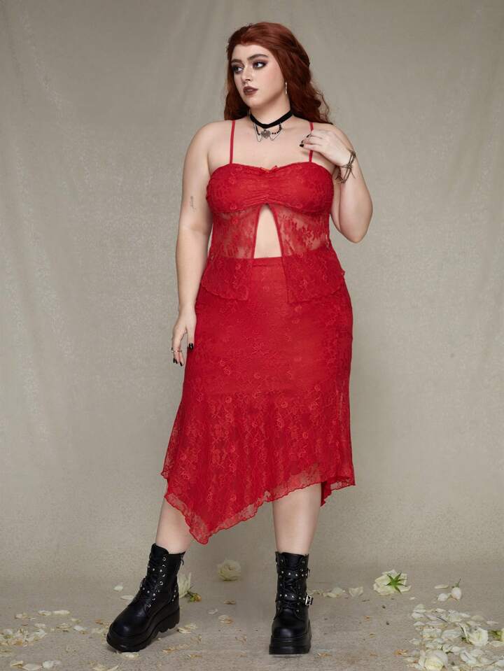 Ensemble Haut Camisole Grande Taille Avec Bordure En Dentelle À Ourlet Fendu Haut Et Jupe À Ourlet Asymétrique