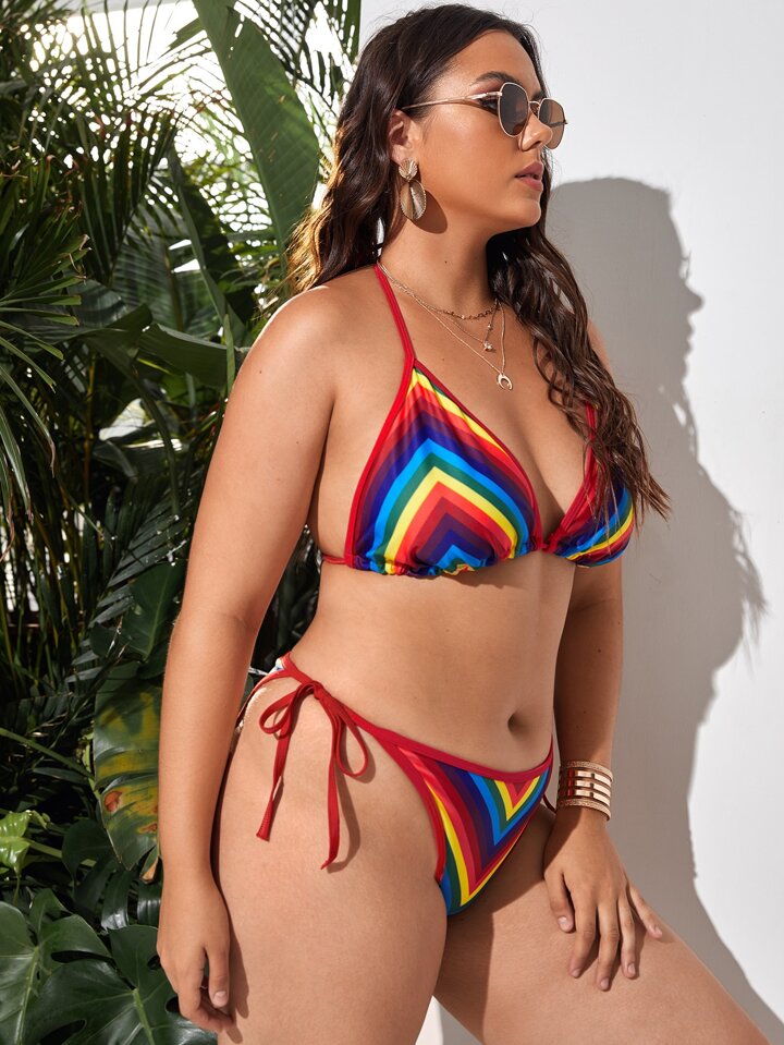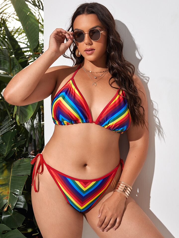 Ensemble de bikini grande taille avec rayures arc-en-ciel et liens noués sur le côté, pour l'été et la plage