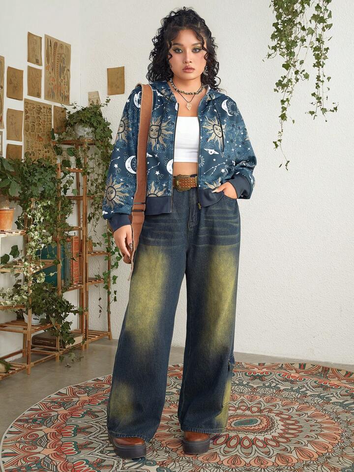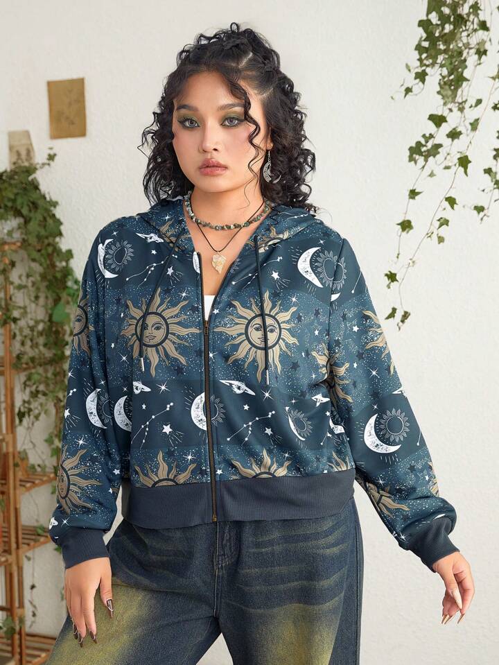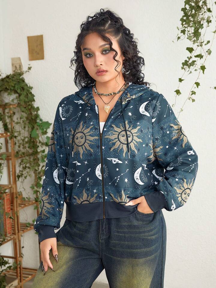 Sweat À Capuche Imprimé Soleil et lune De Grande Taille Avec Fermeture À Glissière
