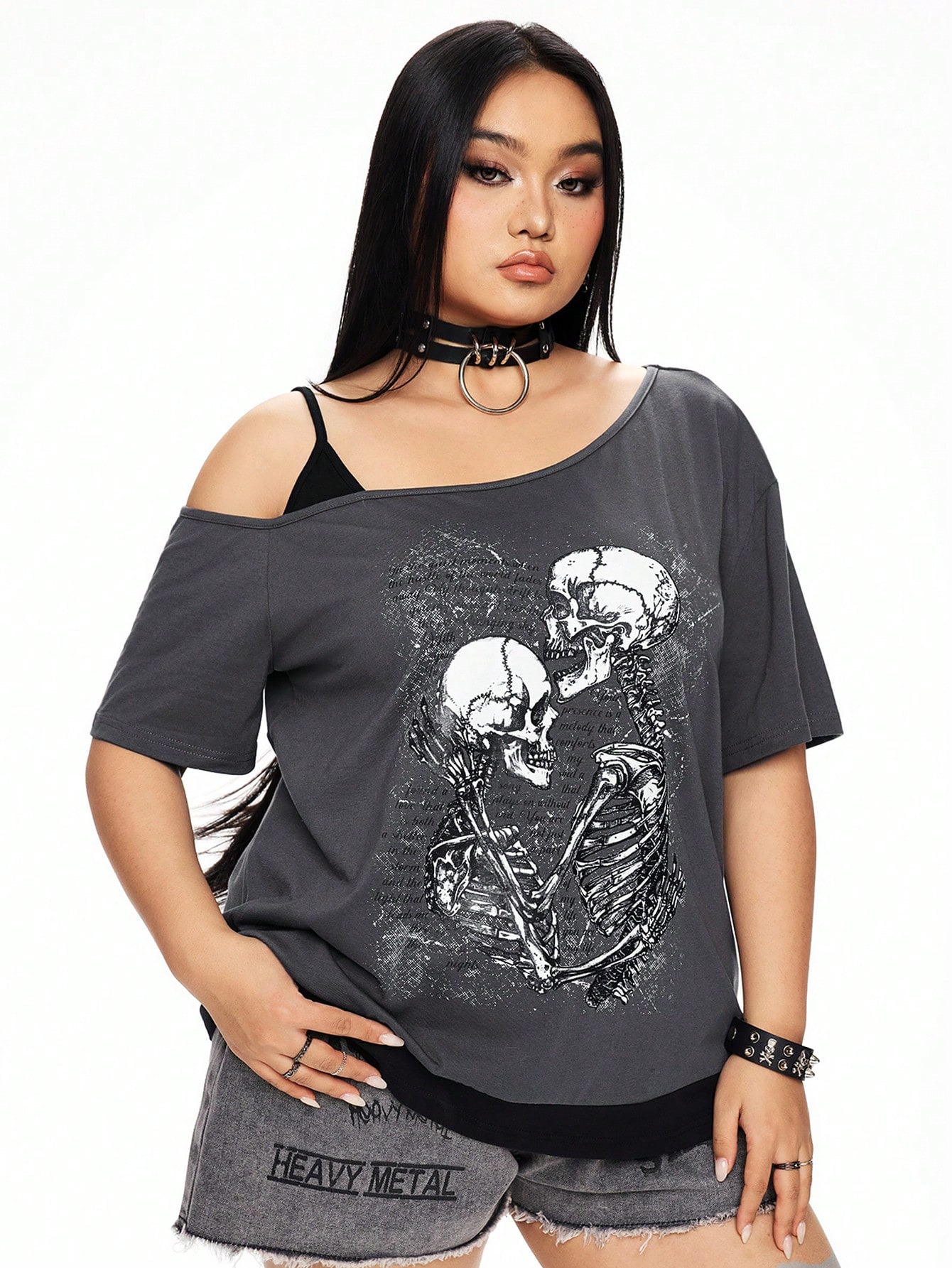 T-shirt gothique grande taille coupe ample avec épaules obliques, imprimé tête de mort et texte, 2 en 1