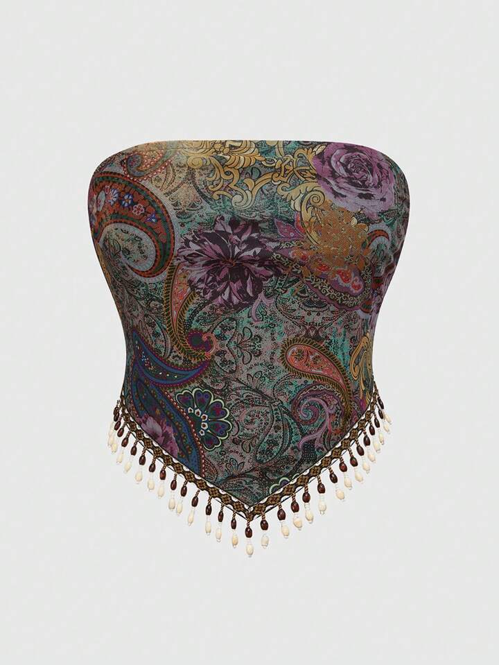 Tee-shirt bandeau bohème surdimensionné pour femmes, imprimé cachemire, avec frange en perles de bois transparent. Style hippie vintage, adapté aux festivals de musique western.