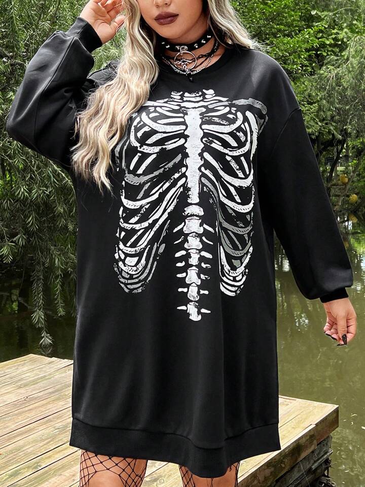 Plus Robe Sweat-Shirt Imprimé Squelette Épaule tombante Fendu