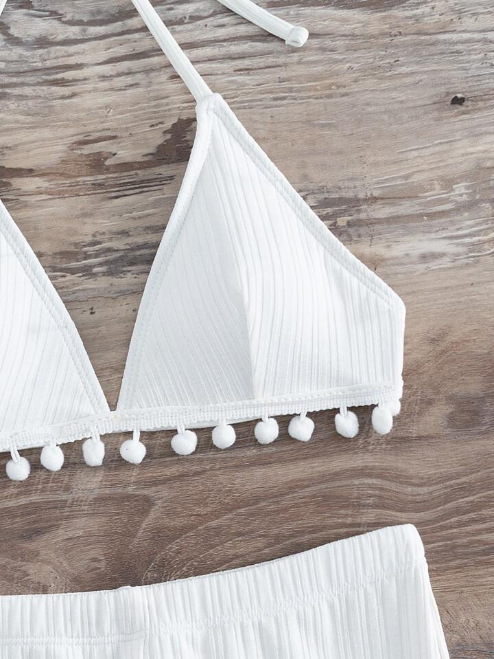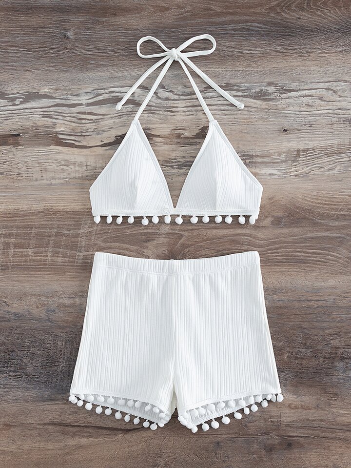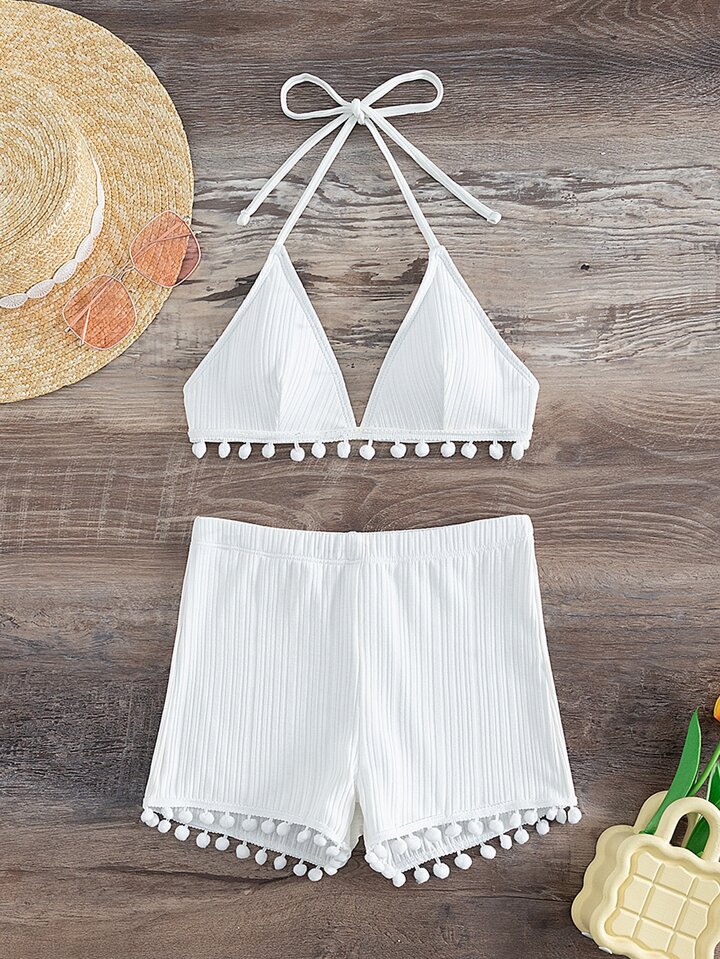 Ensemble bikini d'été à dos-nu avec pompons, de coupe triangle pour la plage