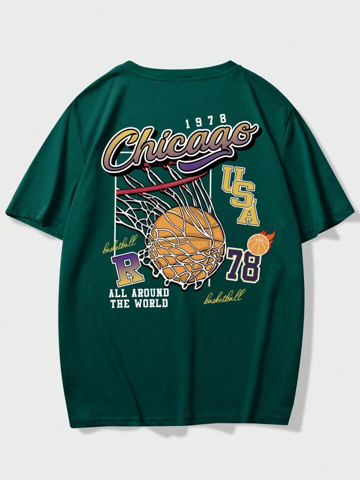 Prep T-shirt à motif de basket-ball et de lettres pour hommes, école